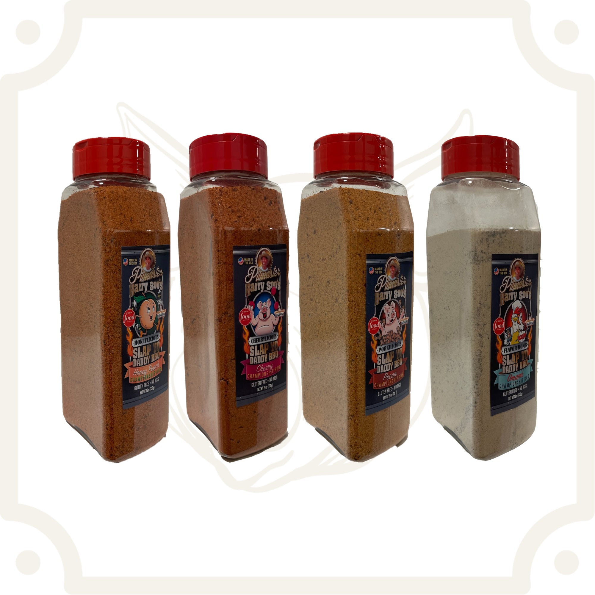 Slap Yo Daddy Pork Butt & Ribs Competition Pack (4 Pack of Rubs: Honeylicious Honey Peach, Cherrylicious Ribs Cherry, Porkilicious Pecan, and Flavor Bomb Umami)